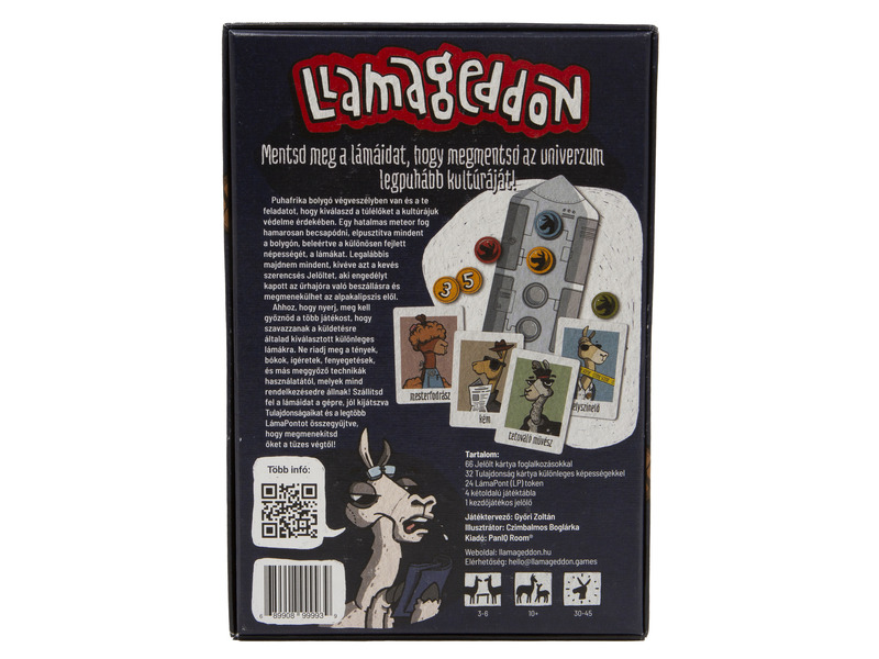 Puhafrika még sosem volt ekkora veszélyben! A Te feladatod kiválasztani azokat a Lámákat, akik egy egész bolgyó kultúráját örökítik tovább. Már csak néhány nap és egy hatalmas meteor csapódik be Puhafrika területére. Ugye számíthatnak rád? A Llamageddon egy könnyed kommunikációs partijáték, 3-6 játékos részére. 10 éves kortól.