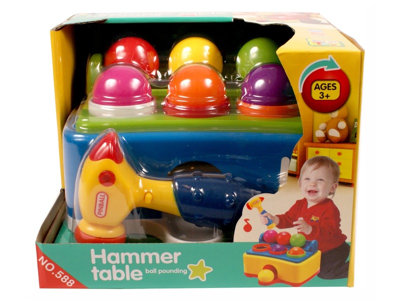 A kalapácsos asztal egy készségfejlesztő ügyességi játék a legkisebbeknek. A játék lényege, hogy a zenélő kalapáccsal le kell ütni a labdákat a lyukon. A játék nagyon szépen fejleszti a pici kézügyességét és megfigyalő képességét. A kalapács minden sikeres koppintásnál vidámzenét vagy hangokat játszik, ráadásul a leütött golyók a játék alján jelennek meg. A játék 2 db AA ceruzaelemmel működik, a csomagolás az elemeket nem tartalmazza.