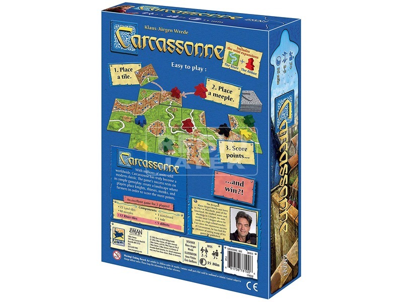 Építsétek fel Carcassonne városát. Kinek marad végül alattvalója? A többszörös díjnyertes Carcassonne társasjáték egy egyszerűbb stratégiai játék, amit akár öten is játszhattok! A játékban a játékosok sorban leraknak egy lapkát, követőt állítanak rá és begyűjtik a pontokat. A tájat szépen berendezik, és a tájakon lévő követők, köztük az útonállók, lovagok, földművesek és szerzetesek segítenek a sikerhez vezető úton! A készlet két mini kiegészítőt, a folyót és az apátot is tartalmazza. Tartalom: 72 tájlapka, 40 követő, 1 értékelő tábla, 12 folyó tájlapka, 5 apát figura, játékszabály.