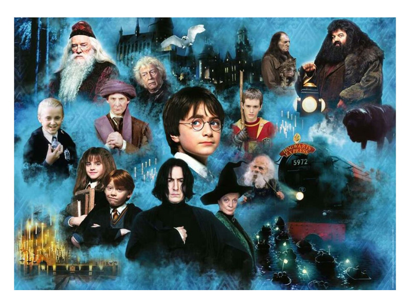 A Ravensburger 1000-db-os puzzle - Harry Potter varázslatos világa című képen a híres mágus és a többi filmsorozatbeli szereplő látható.