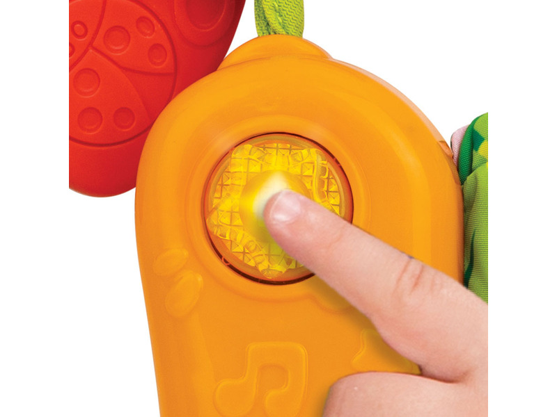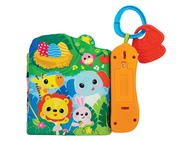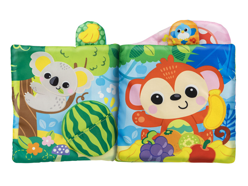 Zenés szórakoztató lágy érzékszervi könyv texturált fülekkel. Bababiztos tükör és zörgő. Nyomja meg a világító gombot/madár/banán hangeffektusokhoz és dallamokhoz. Az egyszerű gyűrűs rögzítés babakocsihoz, kiságyhoz vagy autósüléshez csatlakoztatható. Be/ki gomb Hi/Lo hangerővel.
