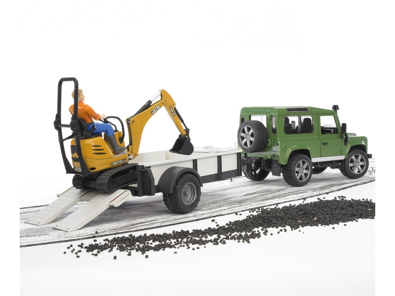 Land Rover Defender egytengelyes pótkocsi, JCB mikro kotrógép és munkás