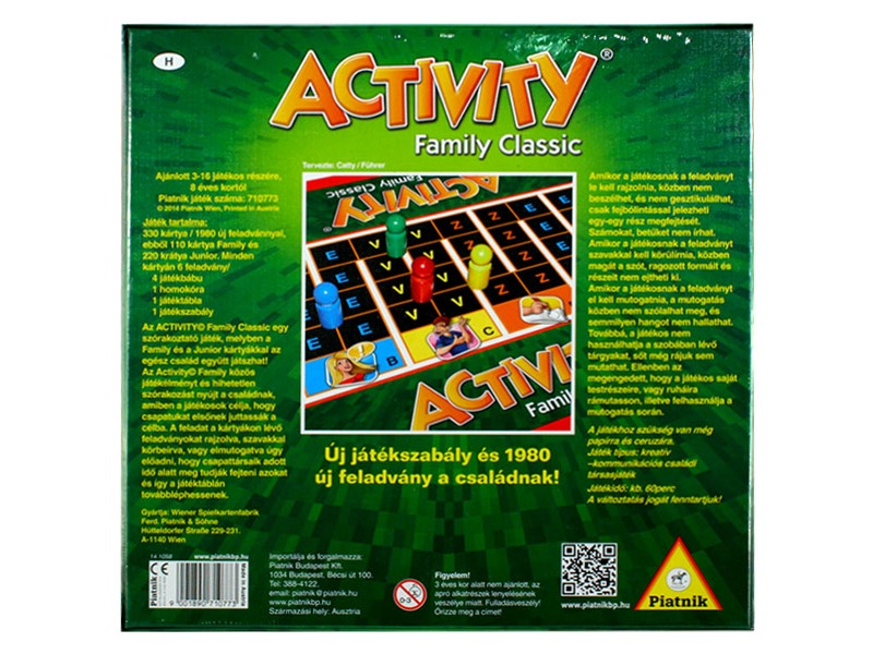 Új játékszabály és új feladványok az egész családnak! Az Activity Family Classic társasjáték Family és Junior kártyákkal játszható, így az egész családszórakozhat! A játék célja, hogy a csapatod elsőként jusson a célba a rajzolós, mutogatós és beszélős feladványok során. A feladványokat időre kell megfejteni, ha körül kell írni a választ, akkor nem lehet se magát a szót, se a ragozott változatait. A rajzolós kérdéseknél számokat, betűket nem szabad írni, míg mutogatás közben nem szabad hangokat kiadni. Az Activity Family Classic társasjátékhoz kellen fog még papír és ceruza is.