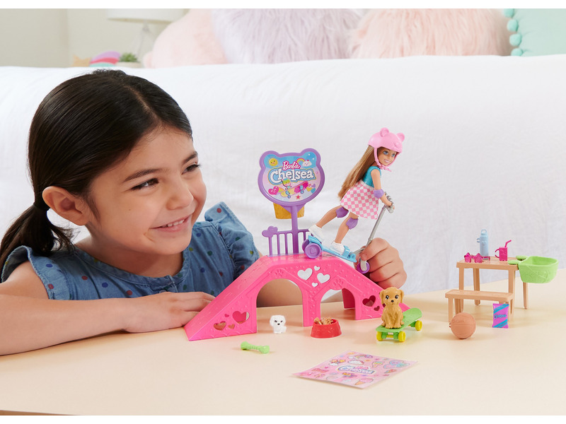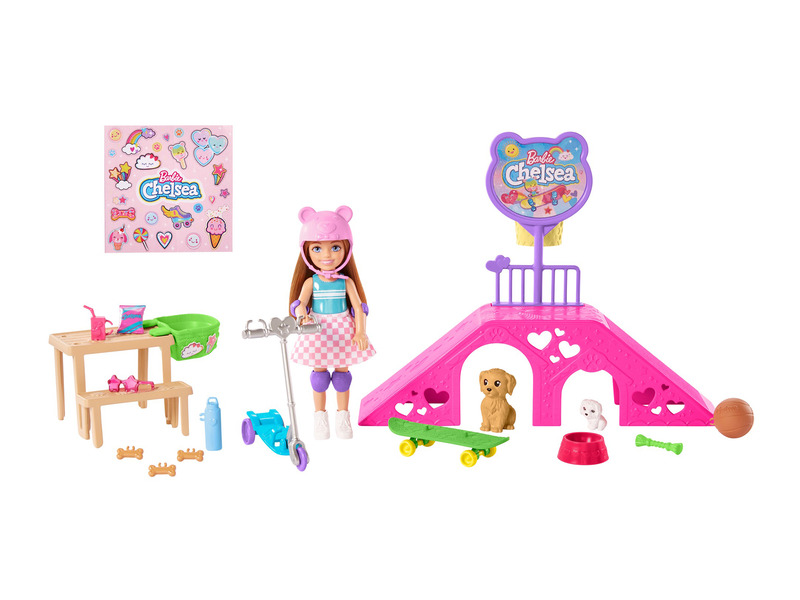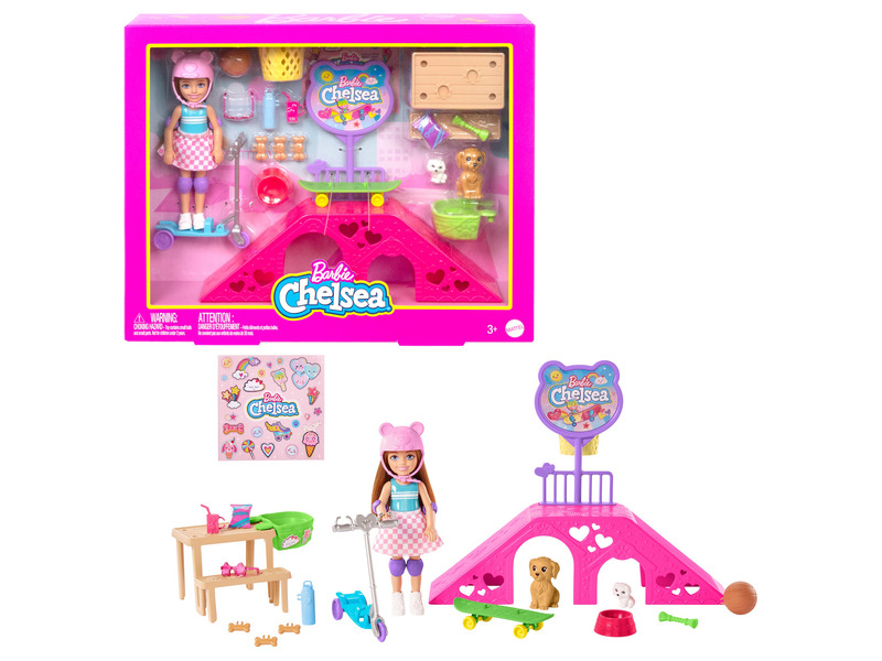 Barbie chelsea gördeszka park Chelsea imádja az aktív kikapcsolódást. Ha teheti, felveszi csinos bukósisakját, felpattan a rollerére és irány a gördeszka park. Természetesen kiskedvencei is vele tartanak egy szuper gördeszkán. A parkban van rámpa, piknik asztal kiskedvenc kosárral, kulacs, nasi, kosárlabdapalánk és sok minden más, hogy egy csodás napot tölthessenek szórakozással. A baba nem áll meg magától. Csomagolás mérete: 31 x 24 x 7 cm 3 éves kortól ajánlott