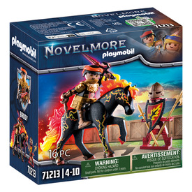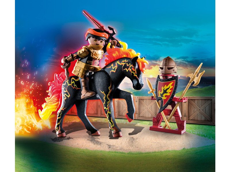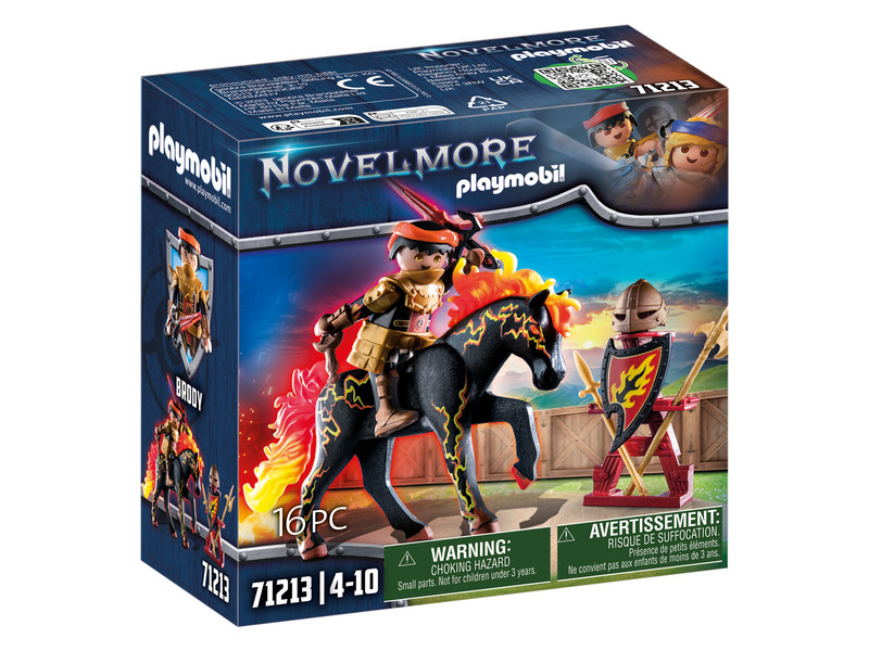 Tűzoltó lovával Brody részt vesz a Novelmore lovagi tornáján. Fegyverállványa készen áll a megfelelő felszerelésre. Vesd bele magad a harcba a PLAYMOBIL felhevült Burnham Raiders Fire Knightjával! Brody Burnham sem akarja kihagyni a lovagi tornát, és bizonyítani képességeit. Tüzes lovával együtt szorgalmasan edz, hogy kiváló eredményt érjen el a versenyen. A fegyverállványon tárolhatja kardját, lándzsáját, pajzsát és sisakját. Remek funkciókkal és érdekes karakterekkel a Novelmore játékvilág izgalmas lovagi kalandokra invitál. Nagyszerű szórakozás 4 éves kortól. A 16 elemből álló játék lovag tartalmaz egy PLAYMOBIL figurát pajzzsal, sisakkal, halberddel, karddal és egyéb extrákkal. A pajzs, a sisak és a fegyverek elhelyezhetők a fegyvertartón. A karbilincsek, a sisak és a fejpánt eltávolíthatók. Ez a készlet játszható önmagában, vagy kombinálható a Novelmore játékvilág többi lovagi játékával.