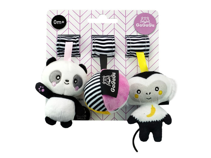 A GaGaGu Felfüggeszthető plüssök - panda, labda, majom tökéletes választás, hogy a babák vizuális és tapintási érzékelésének fejlesztését támogassuk játék közben. A kontrasztos színvilág rendkívül hatékonyan fejleszti a babák látását már a korai hónapoktól kezdve. A kényelmes, tépőzáras rögzítési mód lehetővé teszi a játék tetszőleges helyre, pl. babakocsira, kiságyra, hintára vagy autósülésre történő felakasztását. A cuki figurák nagyon könnyűek és kézre állóak, könnyen tárolhatók és ideálisak arra, hogy magunkkal vigyük egy sétára vagy utazásra.