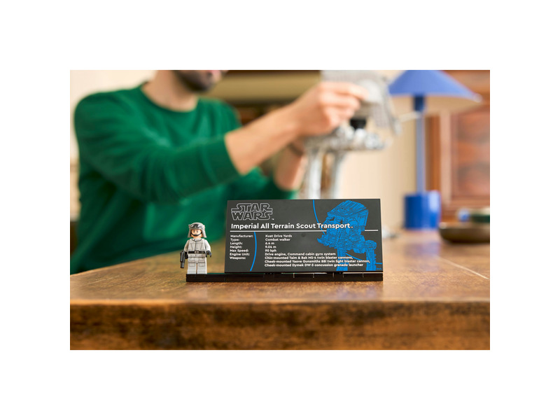 Ehhez a gyűjthető, kockákból épült járműhöz tartozik egy információs tábla és egy különleges LEGO Star Wars minifigura (egy AT-ST pilóta a Birodalom címerével a karján), hogy teljes legyen ez a lenyűgöző kiállítási darab.