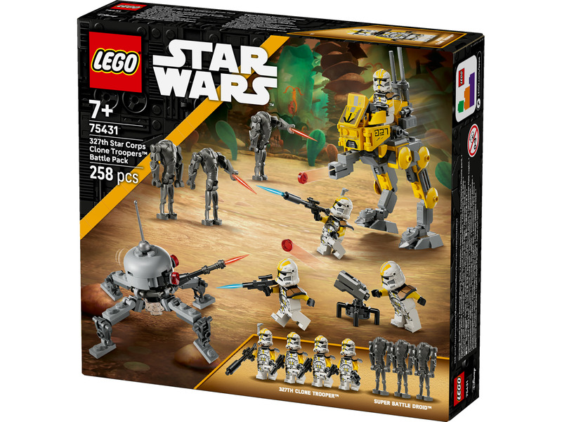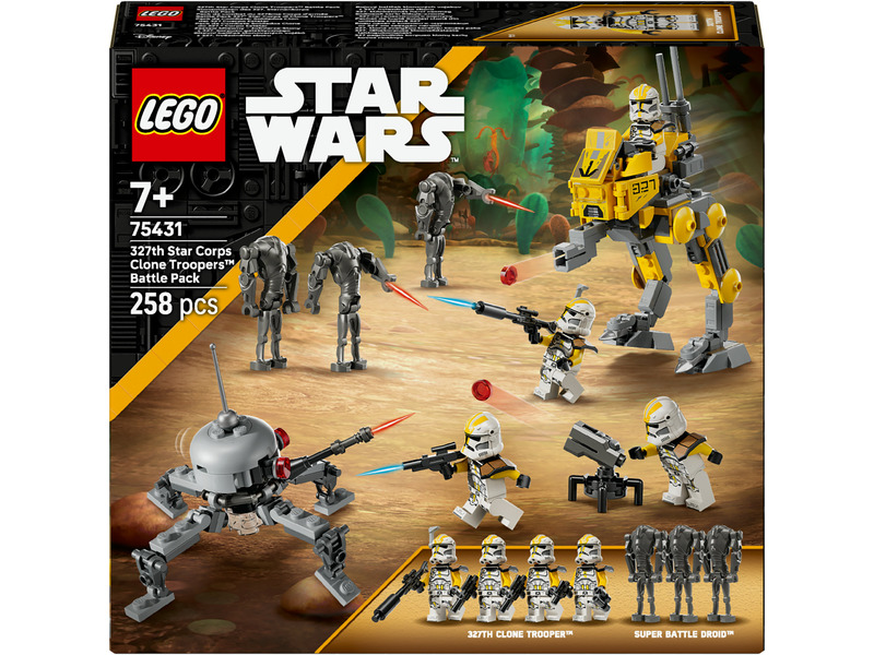 Ebben a gyerekeknek szóló LEGO® Star Wars: A Sith-ek bosszúja harci csomagban (75431) megépítheted a 327. Csillag Hadosztály klónkatonáit, és megküzdhetsz a szuper harci droidokkal! A szett tartalmaz 4 klónkatona LEGO Star Wars™ minifigurát (a 327. Csillag Hadosztály ikonikus egyenruhájában) és 3 szuper harci droid LEGO figurát. Ebben a megépíthető Star Wars játékkészletben egy AT-RT lépegetőt is találsz: fülkéjébe egy LEGO minifigura fér, korongvetőkel van felszerelve, rendelkezik tárolórésszel a sugárvetők és a távcső számára, és található rajta egy lövegtorony is, amit a klónkatonák használhatnak. A szuper harci droidok pedig egy pókdroiddal színesítik az izgalmas ütközeteket.