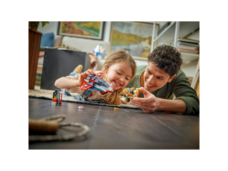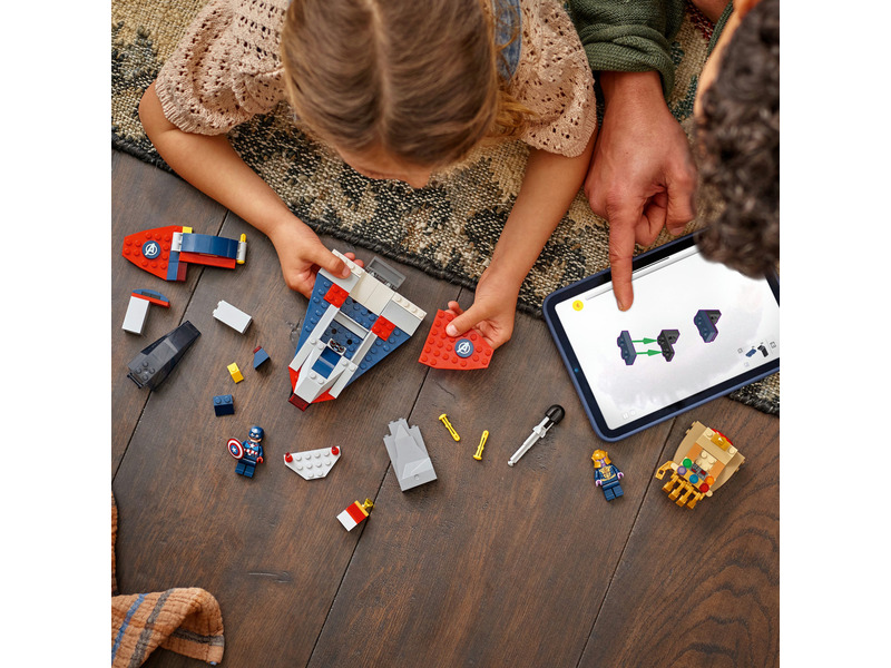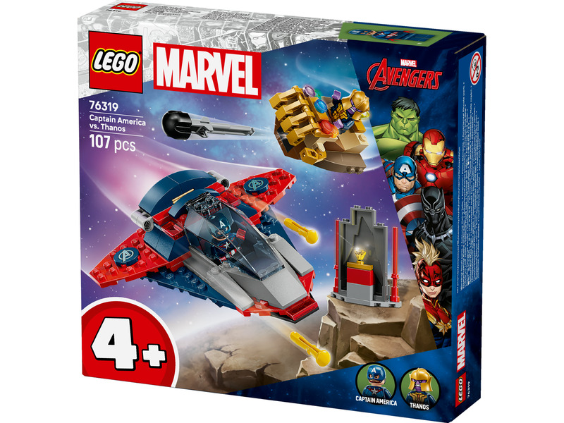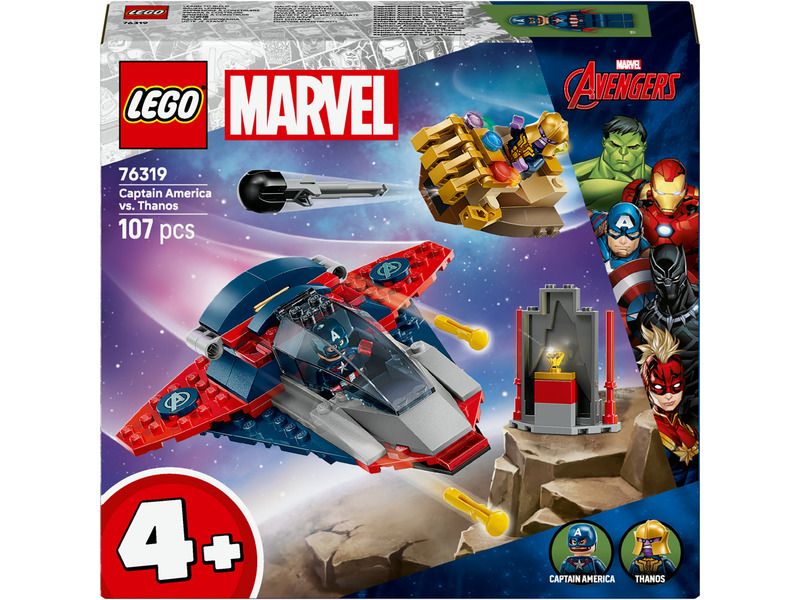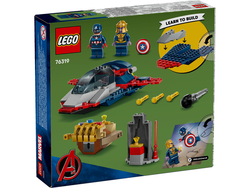 Ez a megépíthető és játékra is alkalmas játék 2 minifigurát tartalmaz: Thanost, egy Végtelen Kesztyűt ábrázoló űrhajóban, amely mozgó „ujjakkal” és rakétakilövővel van felszerelve, valamint Amerika Kapitányt, akinek egy vagány Quinjetje van, amelyen 2 kilövő, felnyitható pilótafülke és egy tároló található, ahová a pajzsát teheted. A fantáziadús játékot egy külön építmény, egy kozmikus kő inspirálja, hiszen Amerika Kapitány próbálja megállítani Thanost, aki az értékes követ akarja megszerezni. Mindegyik zsák építőelemeket és egy nagy kezdőkockát tartalmaz, így gyorsan össze lehet rakni az építményeket és a szereplőket, hogy azonnal indulhasson a játék. Az intuitív útmutatót egy színes füzet formájában tartalmazza a szett. A készlet 107 elemből áll.