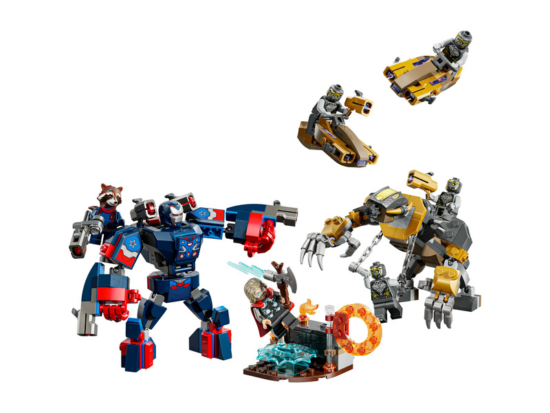 Ez az ikonikus Marvel Bosszúállók-filmjelenet alapján készült, megépíthető szuperhősszett 2 nagy LEGO figurát tartalmaz: egy 4 korongvetővel felszerelt Vashazafi robotot és egy félelmetes chitauri gorillát. Mindkettő csuklós, hogy mozgalmas legyen a játék. A szetthez 7 minifigura tartozik: Vashazafi MK2, Mordály egy nagy korongvetővel, Thor Vihartörővel és 4 chitauri harcos, amelyek közül 2 aranyszínű korongvetővel van felfegyverezve. A szett része még 2 repülő robogó és egy kis hely Thor számára, ahol az extra koronglövedékeket lehet tárolni. Ez a megépíthető játékkészlet kombinálható a Bosszúállók: Végjáték a döntő csata (76323) készlettel, hogy még izgalmasabb legyen a játékélmény. A szórakoztató és intuitív LEGO Builder alkalmazásban az építők felnagyíthatják és 3D-ben elforgathatják a modelleket. Ez a készlet 373 elemből áll.