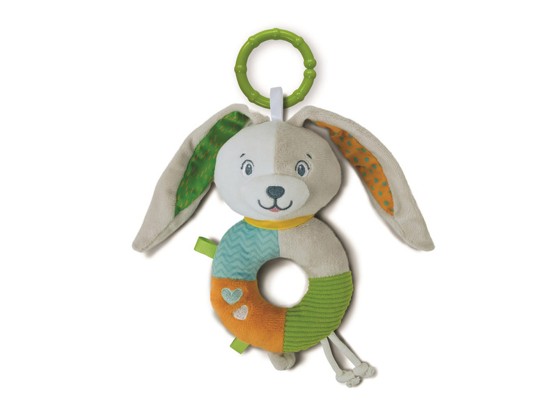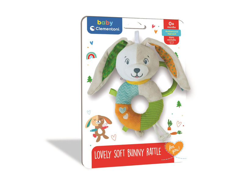 A Clementoni puha nyuszi csörgőt gyűrűs kialakításának köszönhetően babád könnyedén megfoghatja, rázhatja. A felületén lévő különböző anyagok és élénk színek segítik a vizuális érzékelést, a hallást és a kézügyességet. A praktikus gyűrű különböző pozíciókban is felakasztható, így a kis nyuszi mindig a babával lehet. Ideális a gyermek fejlődésének első hónapjaihoz.