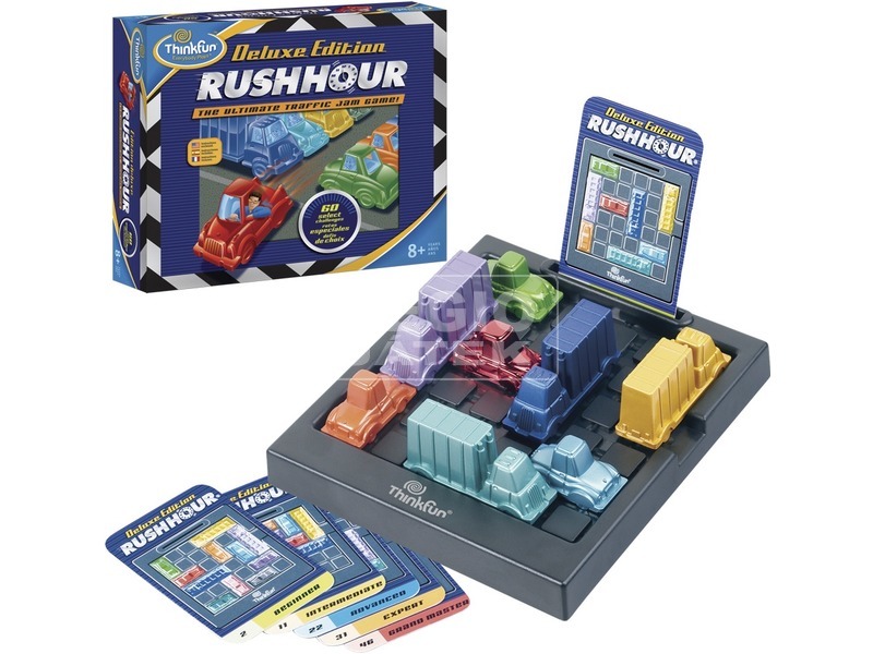 Hozd ki a piros autót a forgalmi dugóból! A Rush Hour Deluxe Edition társasjátékban a me-tálfényezésű autók össze-vissza állnak az úton, elállva a piros autó útját. Az autókat csak a menetiránynak megfelelően, illetve csak tolatva lehet mozgatni, a cél, hogy a piros autó átjus-son az útvesztőn, el tudjon haladni a kereszteződés egyik végéből a másikba. A játék összesen 60 feladványt rejt, a kezdőtől a nagymester szintig, oldd meg mindet!