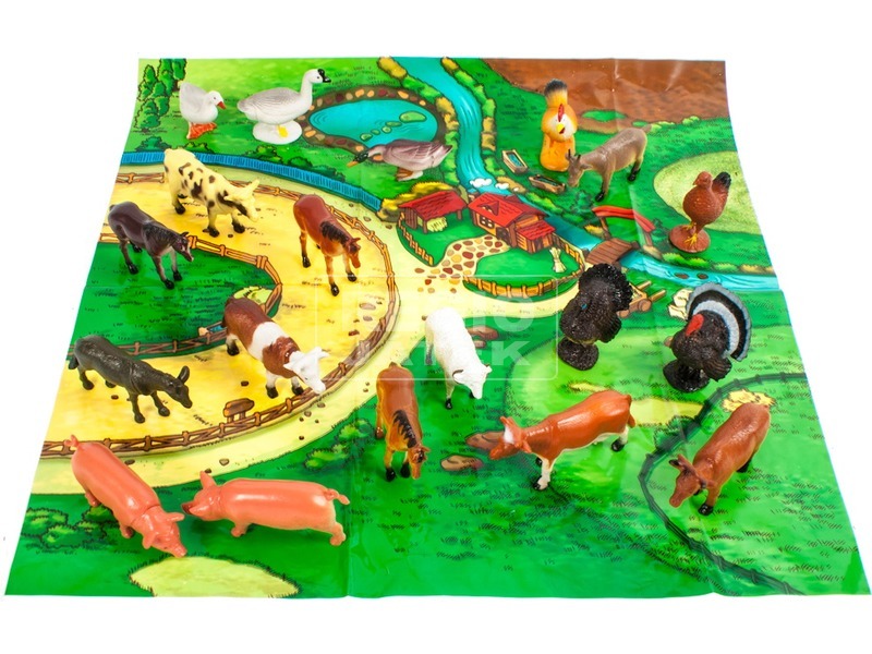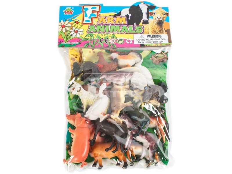 Töltsd fel a farmot műanyag állatokkal! A Háziállatok 20 darabos készlet kakast, libát, szarvasmarhákat, lovat és bárányt tartalmaz, amiket egy gazdaságban tudsz elhelyezni. Az állatok szép festéssel, igényes kidolgozottsággal készültek, a csomagban kerítéselemeket, szalmabálákat és egy hátteret is megtalálsz. A Háziállatok 14 darabos készlet állatainak mérete: 10 cm.
