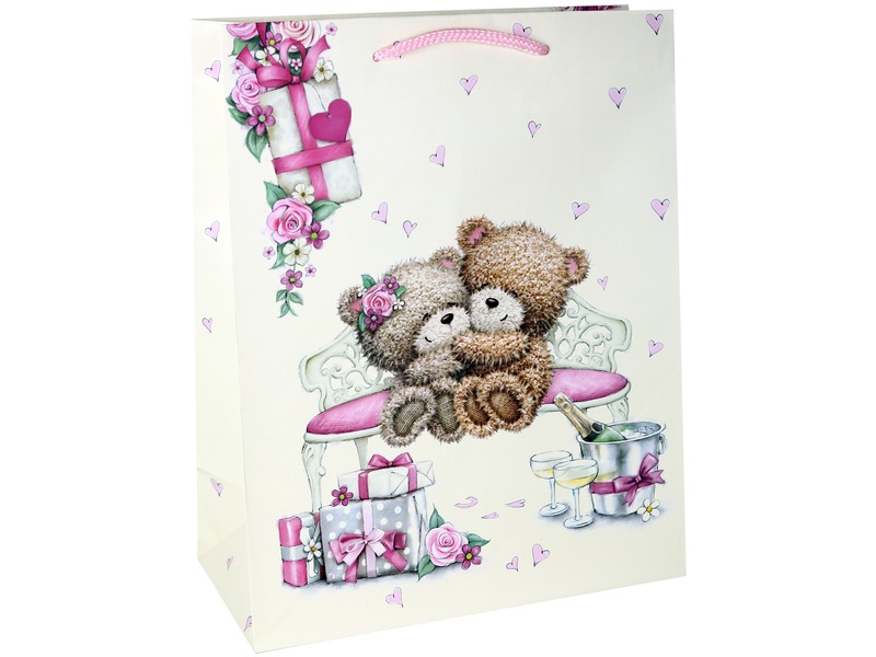 Lepd meg szeretteidet ezzel a bájos papírtasakkal, amelyen egy kedves szerelmes macipár díszeleg! A 26 x 32 cm-es méretének köszönhetően tökéletes választás kisebb ajándékok, plüssök, könyvek vagy édességek csomagolásához.