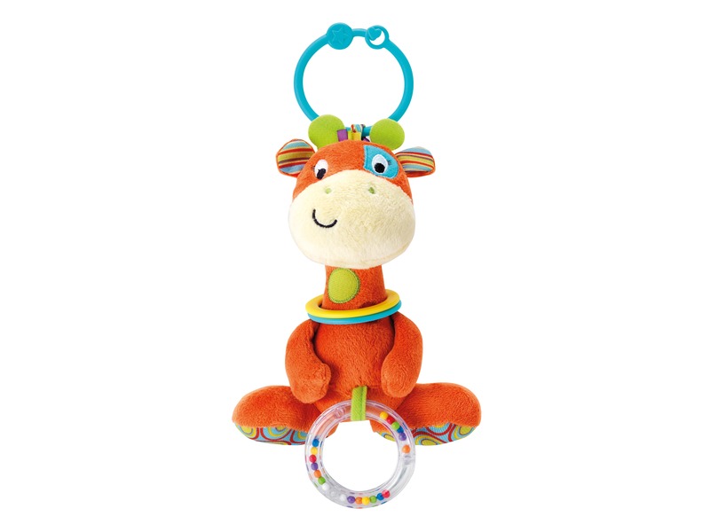 Vidám barna zsiráf, csörgő-zörgő hangokkal! A Zsiráf plüss csörgő egy puha, barna színű zsiráf, széles mosollyal és színes kiegészítőkkel. A zsiráf testrészeit különféle textilek borítják, amiknek más és más a tapintása, a csörgő egy karikával is fel van szerelve, amivel babakocsira vagy a kiságyra is fel lehet fogatni. A Zsiráf plüss csörgő megnyugtatja a picit, és elősegíti a tapintás fejlődését is. A zsiráf mérete: 20 cm.