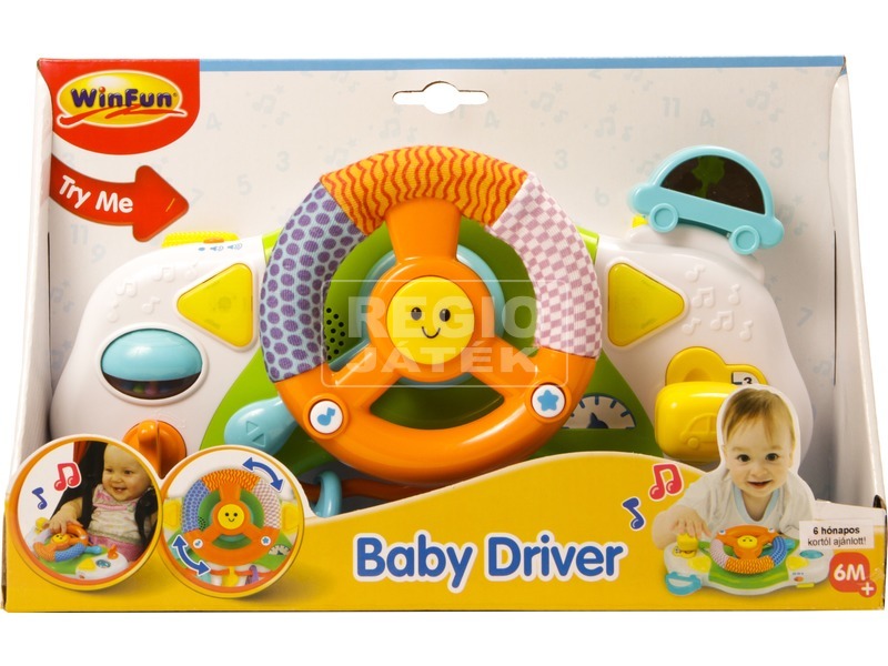Az autóvezetést nem lehet elég korán kezdeni! A Zenélő-világító műszerfal kormánnyal bébijáték egy autós szimulátor, amivel a baba az autósülésben is tud játszani, utánozva a felnőtteket. A kormány valós autóhangokat ad ki magából, az irányjelzők villognak, a dudád megnyomva a játék kürthangot hallat. A műszerfal szórakoztatja a picit, fejleszti az érzékelését, a Zenélő-világító műszerfal kormánnyal kiságyra, autósülésre is felfogatható. A játék 2 darab AA ceruzaelemmel működik, a csomagolás az elemeket tartalmazza.