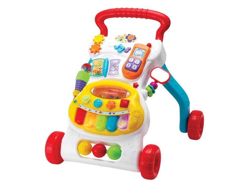 Műanyag járássegítő, ami segít az első lépések megtételében! A Zenélő bébi járássegítő egy tologatható játék, rengeteg meglepetéssel! A járássegítő elején mobiltelefon, zongora és lapozgatható játék is található, amik fényeket és hangokat adnak ki magukból. A zongora különféle zenéket tud lejátszani, a billentyűk színesen világítanak, a telefon megtanítja a számokat a picinek. A járássegítő különlegessége, hogy a baba tologatni tudja, és ha még nem tud stabilan sétálni, segíti a haladást. A játék 3 darab AA ceruzaelemmel működik, a csomagolás az elemeket tartalmazza. Méretek: 38 x 33 x 47 cm.