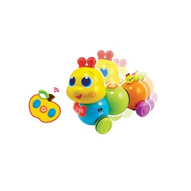Araszolgató kukac figura, akit távirányítóval mozgathatsz! Az Első távirányítós hernyóm egy műanyagból készült színes kukac, aki mozgás közben még zenélni is tud! A kukac kedves arca és széles mosolya hangos kacagásra ingerli a babát, miközben kúszik-mászik a kis hernyó, a nyakkendője világít, és a játék különféle dallamokkal szórakoztatja a gyereket. A kukac hátán lévő gombbal indul a zene, a hernyót az alma formájú távirányítóval lehet mozgatni. A játék 3 darab AA és 2 darab AAA ceruzaelemmel működik, a csomagolás az elemeket tartalmazza. Méretek: 32 x 14 x 25 cm.