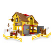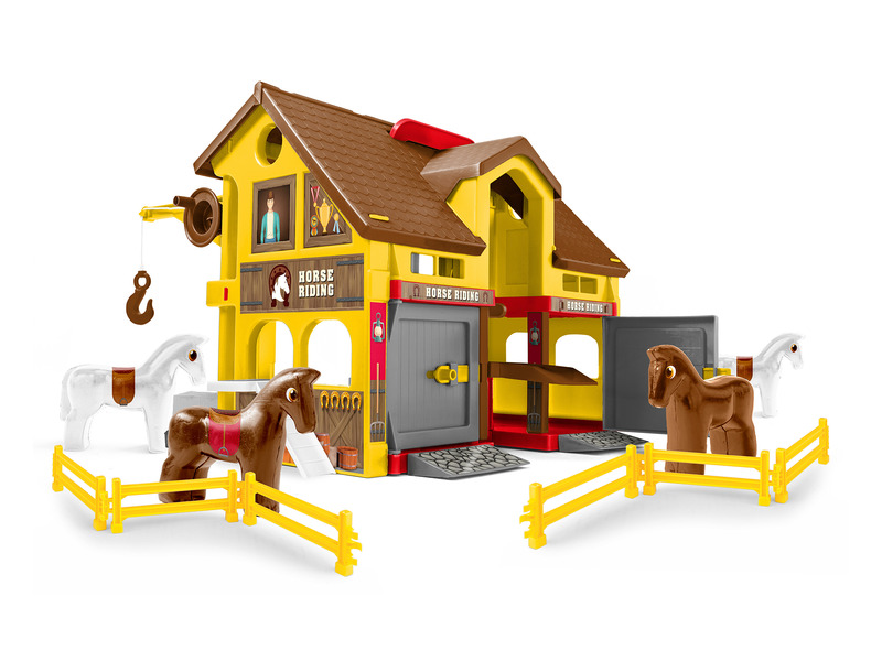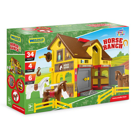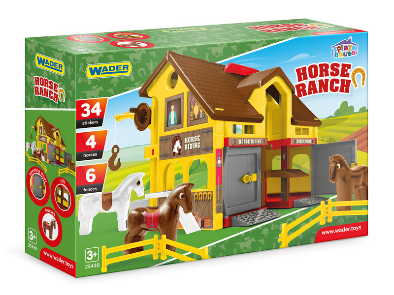 A kétszintes Lófarm Wader egy olyan készlet, amely egy igazi ménesben reprodukálja az életet, tágas istállóval a lovak számára, szállítólifttel a ménes alkalmazottai számára, valamint lovasfelszerelés-kölcsönzéssel. A ménesbirtok rengeteg lehetőséget kínál a játékra, a lovak napi díjlovaglására és etetésére, lovas felszerelések bérlésére és lovasiskola működtetésére. A ház a tetőre szerelt konzollal is fel van szerelve, így könnyen mozgatható bárhová. A termékkel való játék az elemek összeszerelésének pillanatától kezdődik, s mind az összeszerelés mind a játék során fejlődik a kisgyermek képzelete, logikus gondolkodása és vizuális-térbeli intelligenciája. A készlet tartalmaz egy nyitható ajtóval ellátott házat (37 cm x 30 cm), egy szállítóliftet, 4 lovat, 6 lovas karámot, 2 tartályt vízhez és ételhez, akadálypályát, darut a széna szállításához, rámpákat és 34 db matricát.