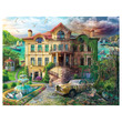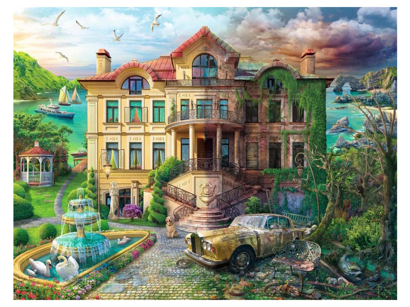 A Ravensburger 2000 db-os puzzle - Cove Manor képen egy pompás villa jelenik meg újkori fényében és az elhagyatottságot mutató mohás formájában egyaránt.
