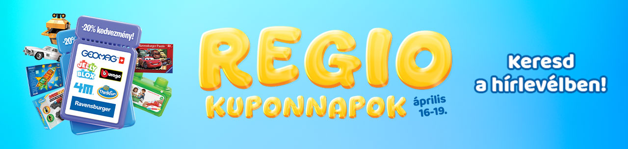 A kuponkódok 2026. április 16-19. között érvényesek minden teljes árú Ravensburger, 4M, Jelly Blox, Geomag, Bburago és Thinkfun termékek vásárlása esetén. Más kedvezménnyel nem összevonható!